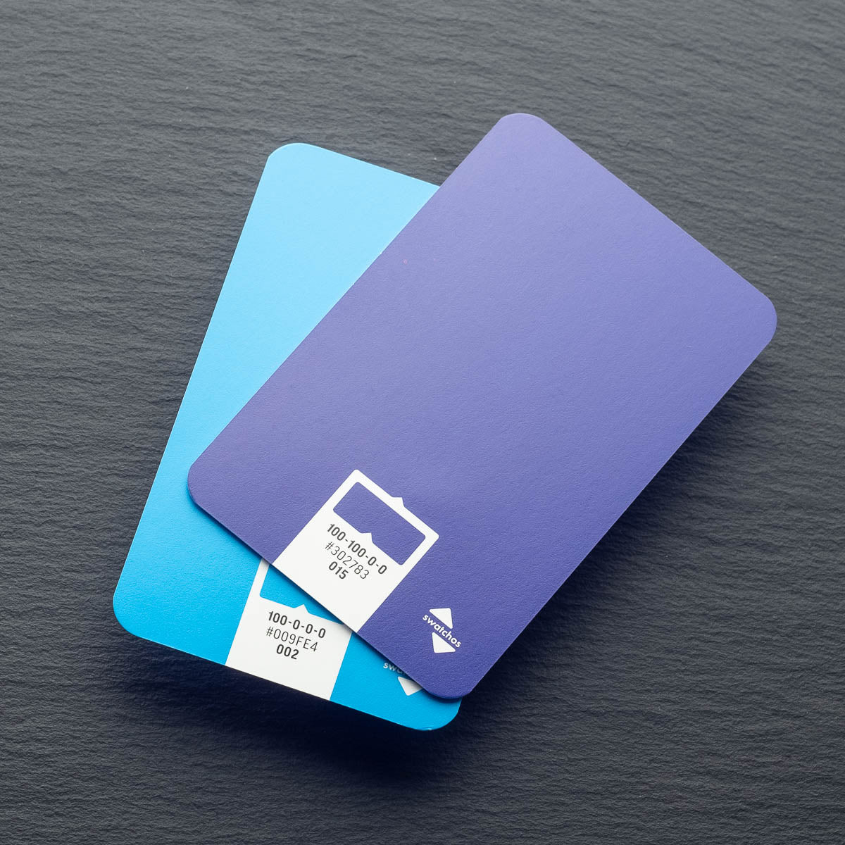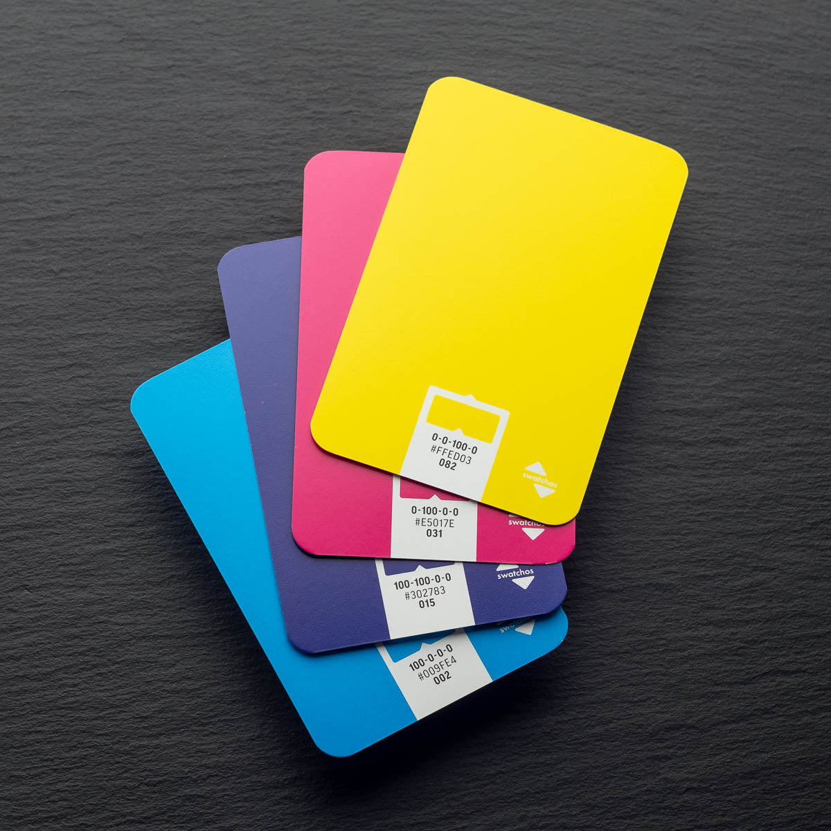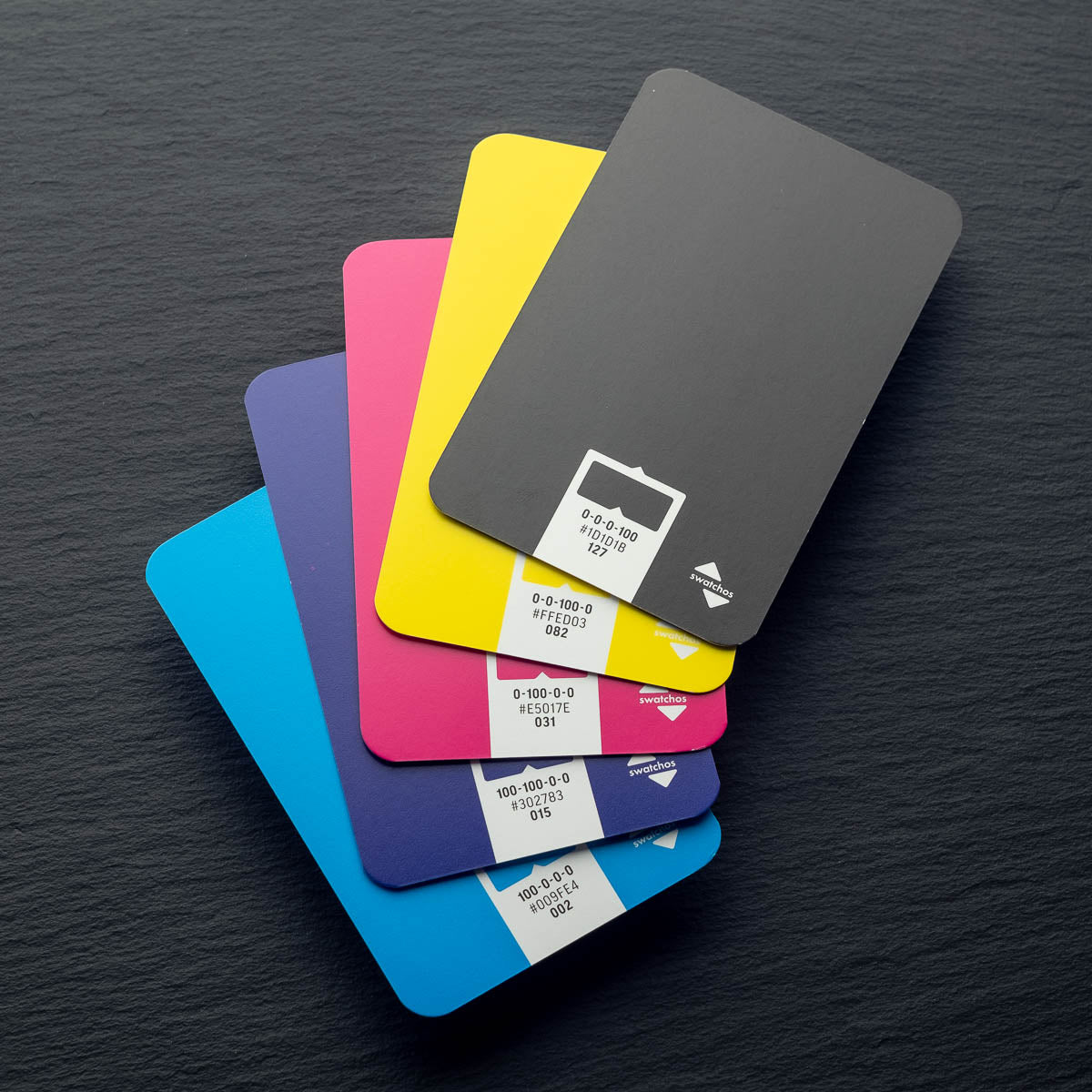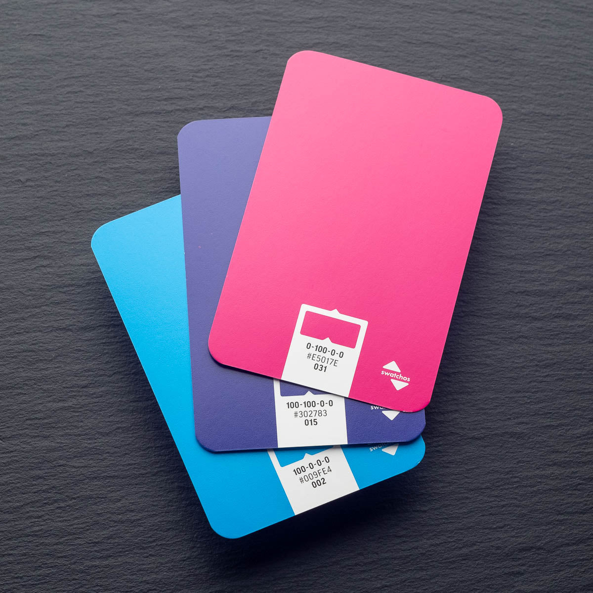 Swatchos have been designed to be as colour accurate as possible. The cards themselves have been designed using the FOGRA39 colour profile which keeps the colour between the designer (me) and the printer as accurate as possible. The conversion of the those colours to RGB has also been carried out in a controlled way from CMYK FOGRA39 to sRGB.
